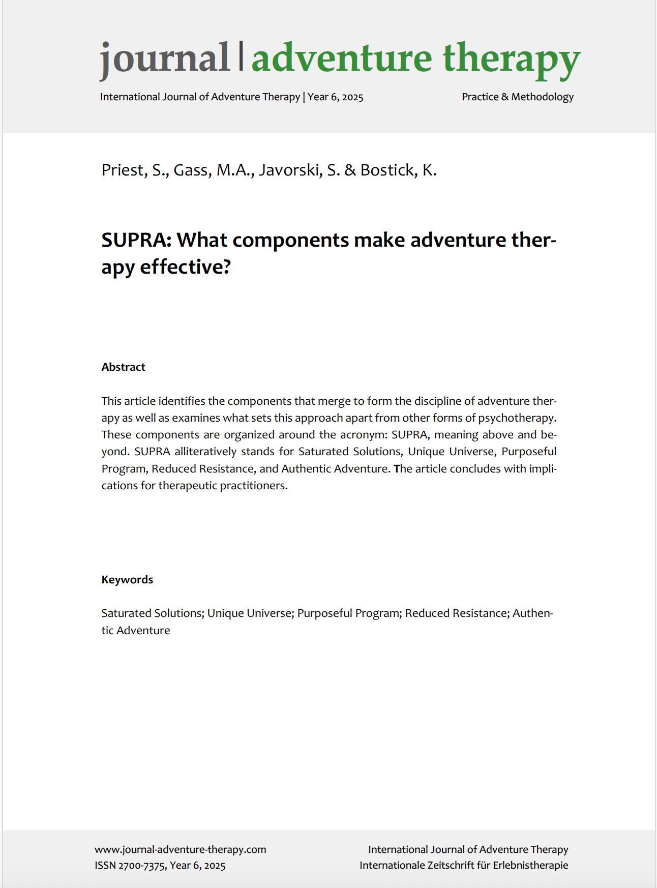This article identifies the components that merge to form the discipline of adventure therapy as well as examines what sets this approach apart from other forms of psychotherapy. These components are organized around the acronym: SUPRA, meaning above and beyond. SUPRA alliteratively stands for Saturated Solutions, Unique Universe, Purposeful Program, Reduced Resistance, and Authentic Adventure. The article concludes with implications for therapeutic practitioners.